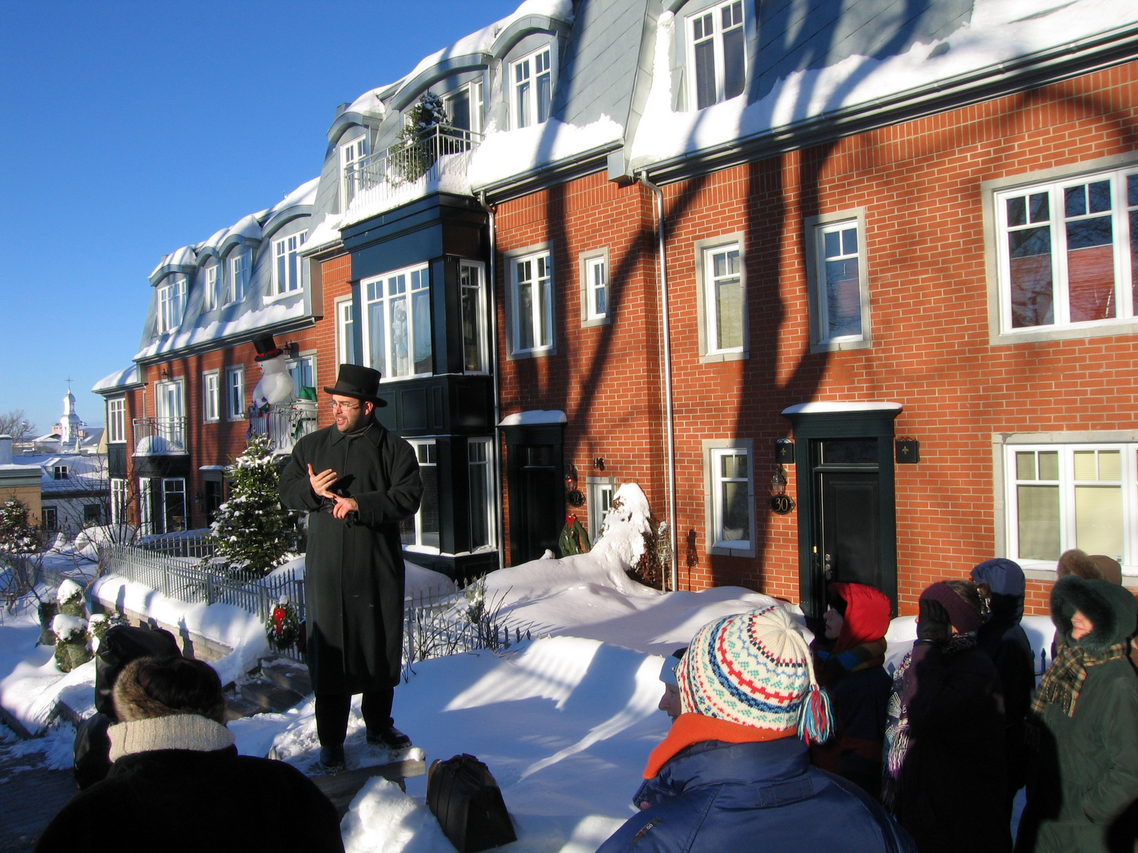 Source: Un guide des Services historiques Six-Associés interprétant Charles Dickens lors de la visite de Noël en 2004-2005, dans le Vieux-Québec, près du parc Cavalier-du-Moulin. (photographe, Annie Boulanger). Archives des Six-Associés.